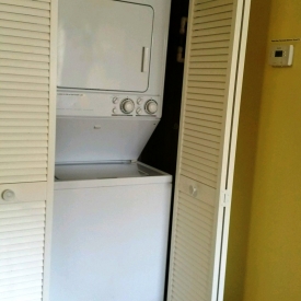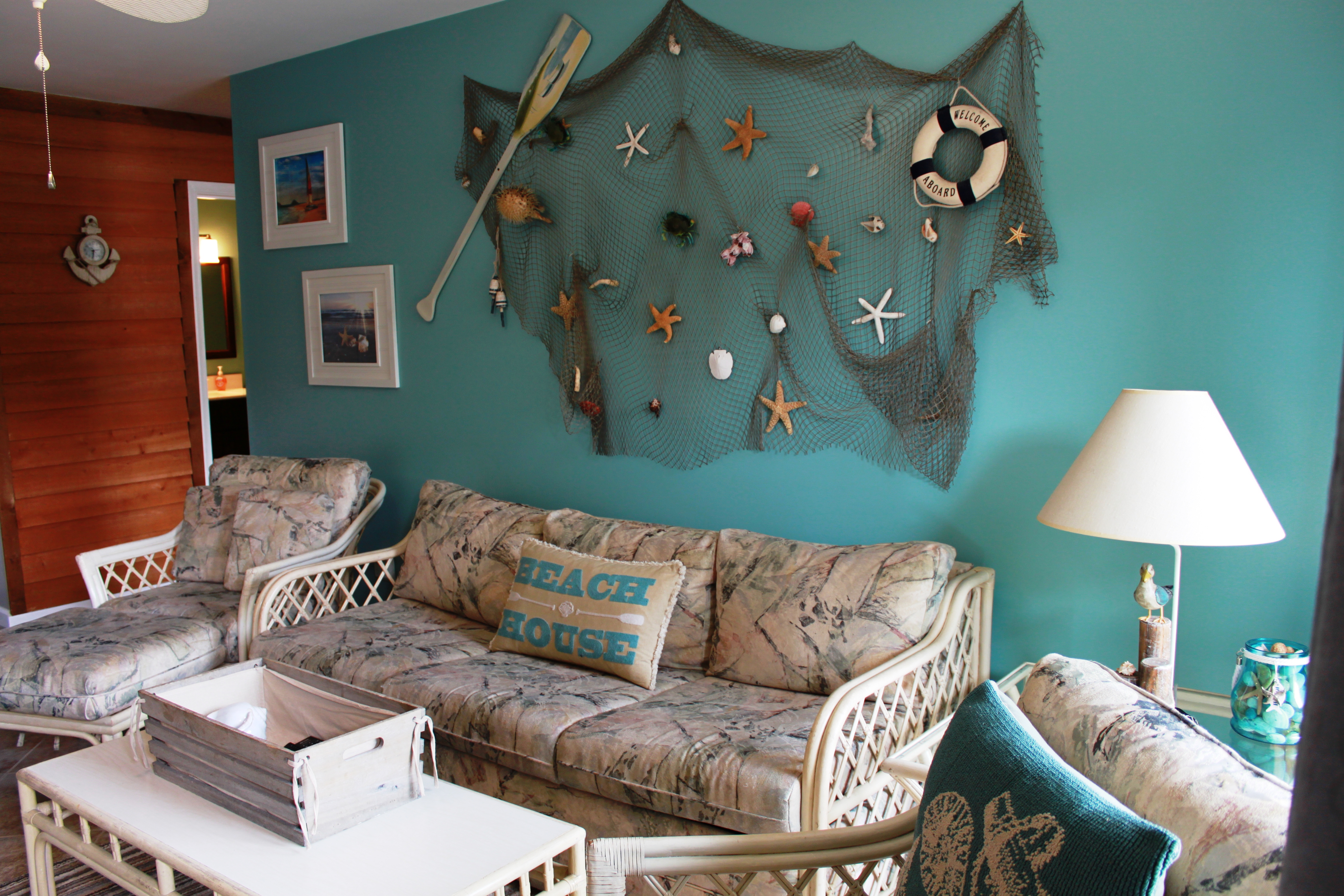 This living room brings the outside sun and surf inside. The beach themed decor and the fishing net accent on the back wall are just two features of this spacious living room. Complete with a rattan furniture set (two chairs, sleeper sofa, coffee table and side table) and a flat screen TV for downtime during your beach vacation.